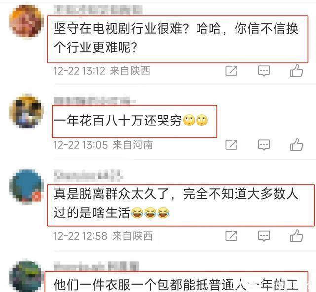 “我以为你揭不开锅了,结果你说三天没吃燕窝了。” 普通人一年攒个几万都费劲,她儿子一部戏几十万,就这还说一年没个百八十万不行。